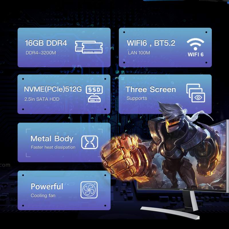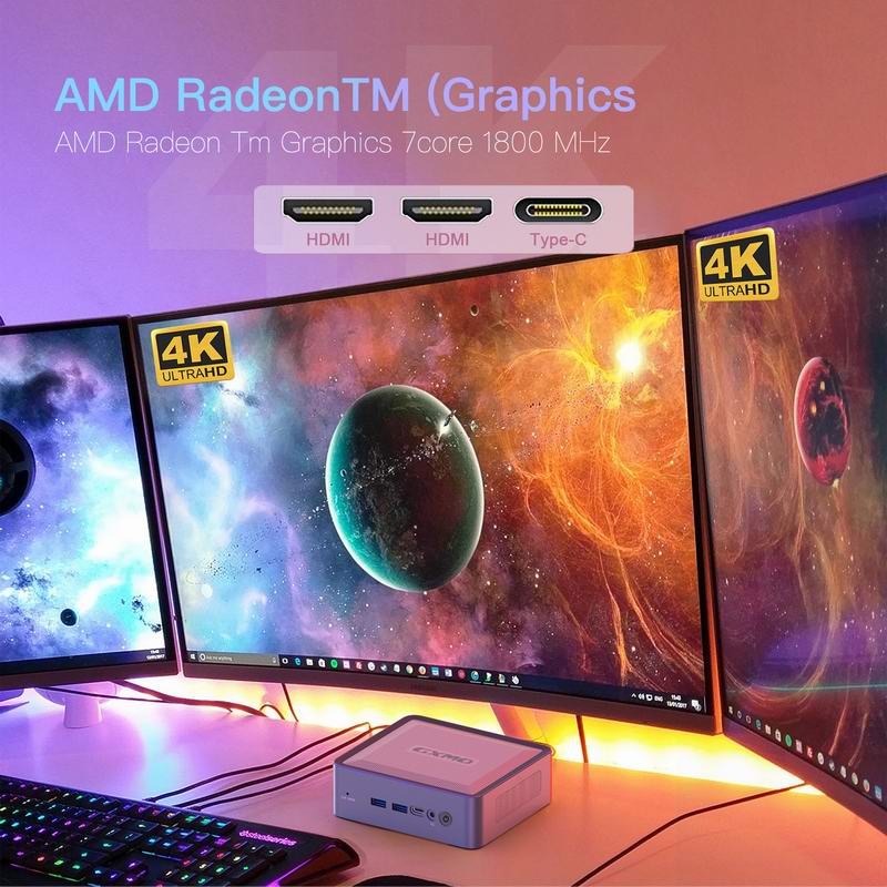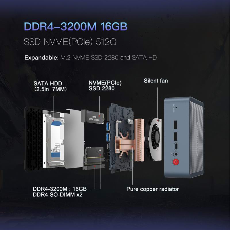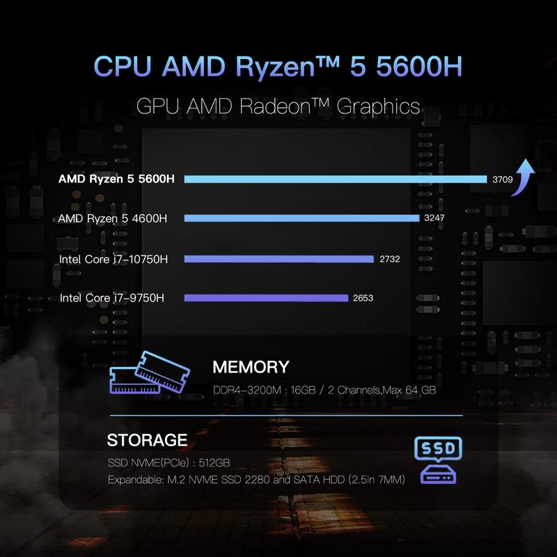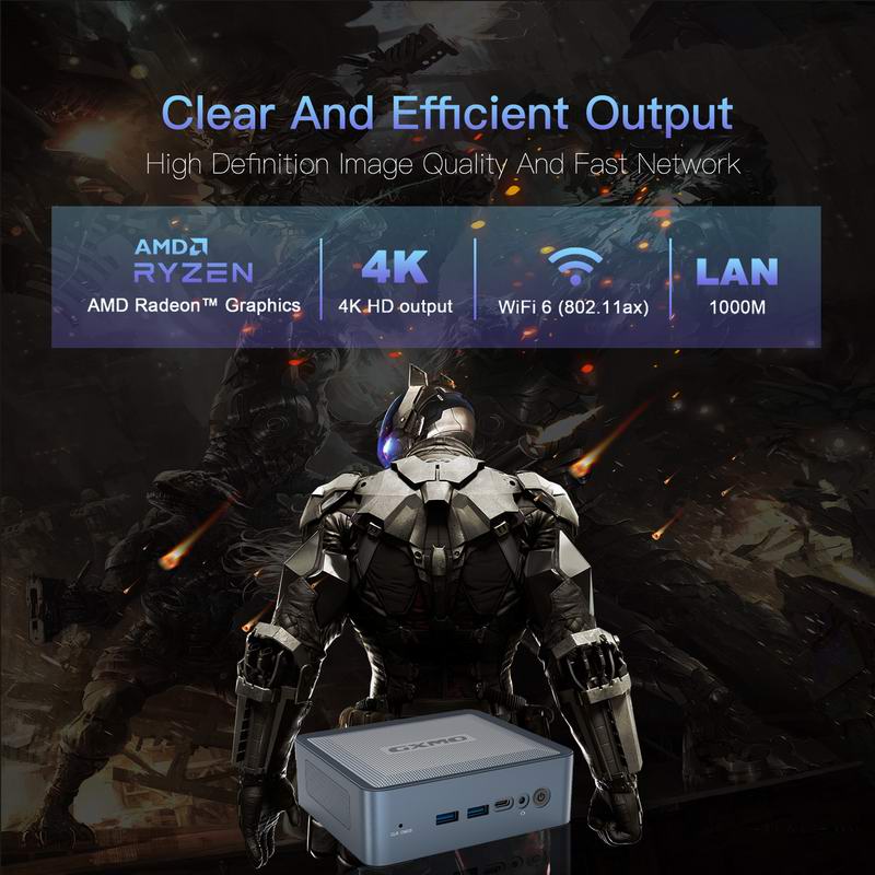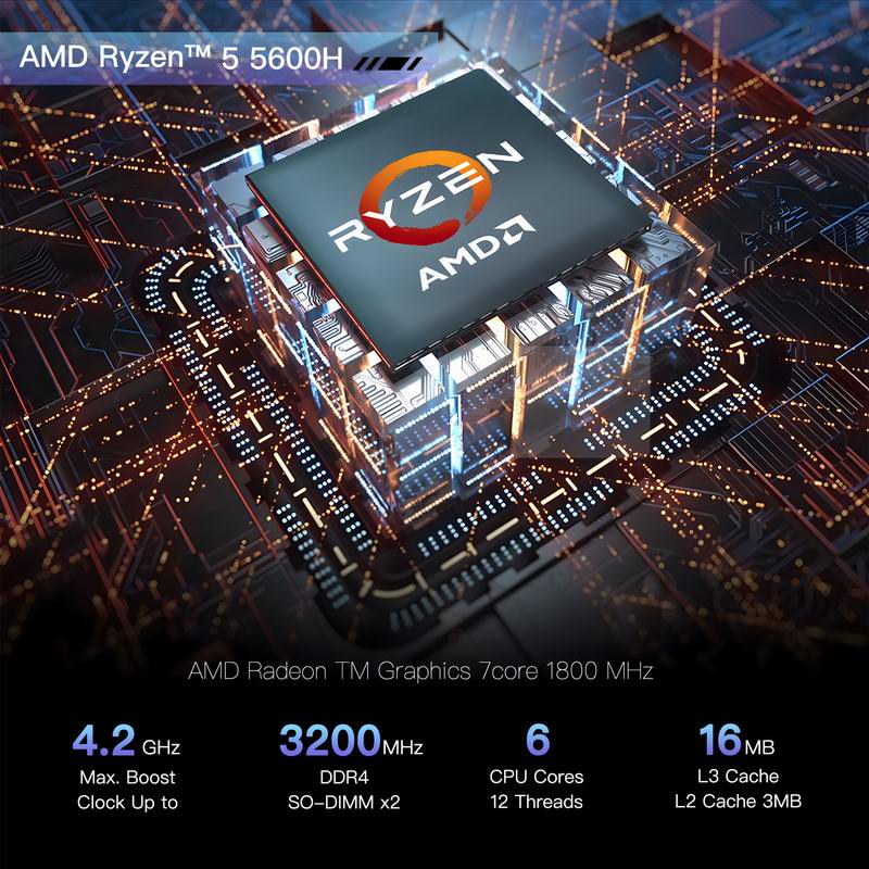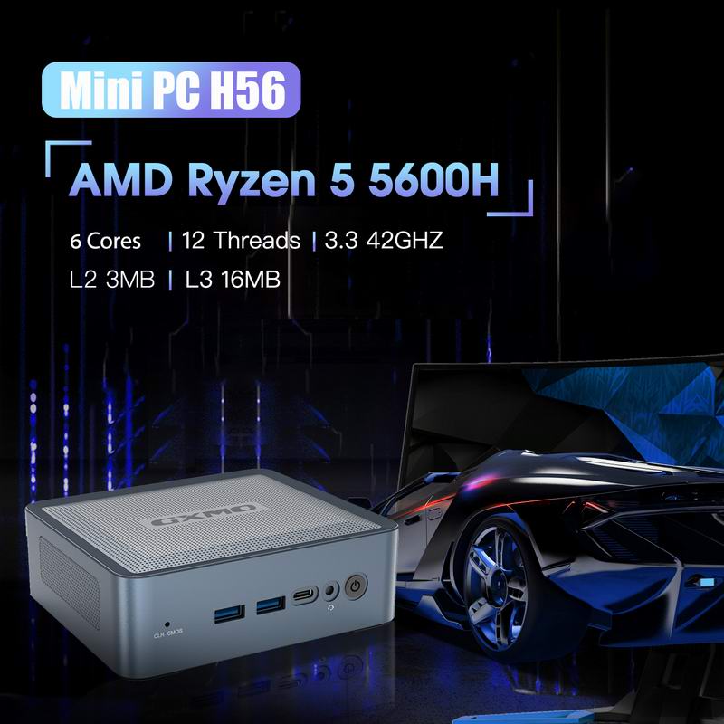 • GXMO H56 Mini PC Mini Desktop PC AMD Ryzen™ 5 5600H 6-core 12 Threads 3.3 42GHZWindows 11 Pro DUAL-CHANNEL DDR4 512GB NVME SSD Mini Desktop PC, AMD Radeon Graphics 1800MHz, dual HDMI and USB-C 4K outputs, WiFi6/BT5.26 Cores 12 Threads 3.3 42GHZ